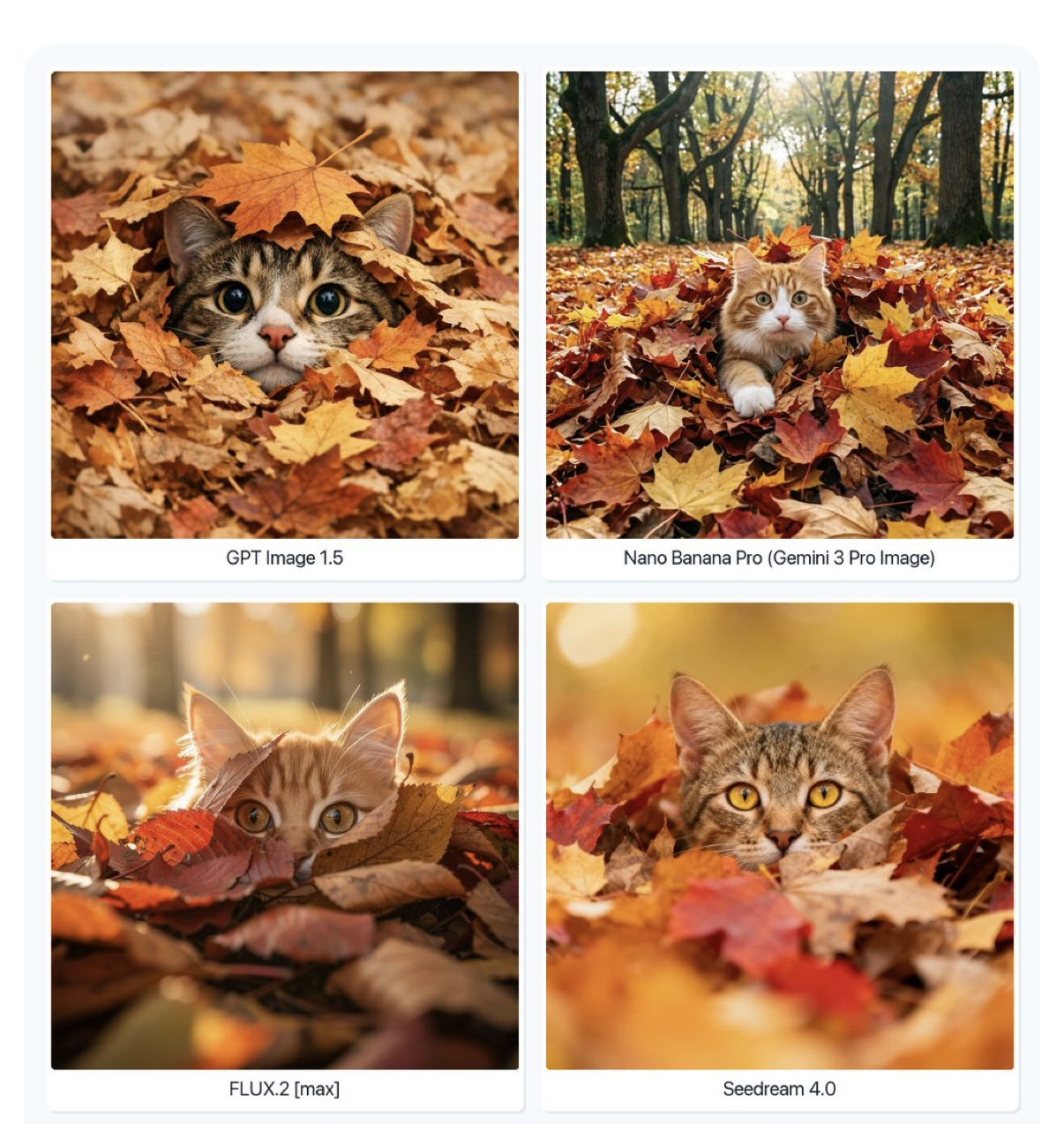 网友和机构也从多个方向进行了测试。Artificial Analysis用目前排行前四的图像模型做了一些测试。第一个是文生图:一只好奇的猫从一堆秋叶中探出头来。