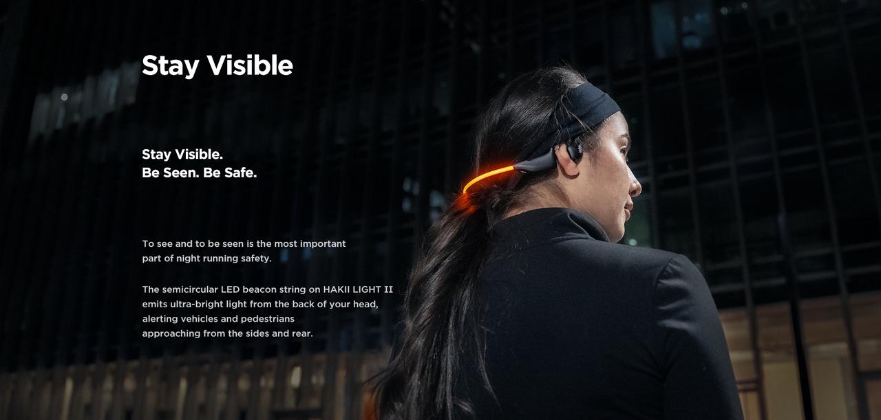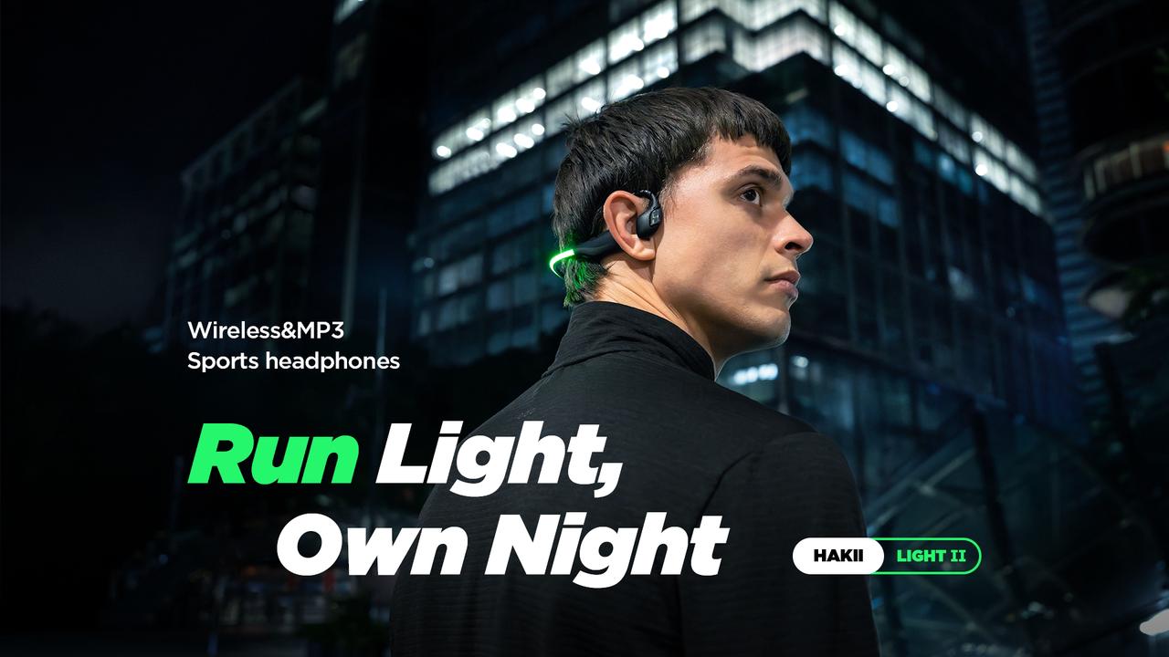 产品说明:HAKII LIGHTⅡ(中文名:哈氪聆光Ⅱ)专为夜跑与夜间骑行设计,以夜间安全为首要目标。180°超亮LED灯带配合多种模式,百米外清晰可见,实现真正的夜间警示。双麦克风降噪与抗风噪结构保证通话清晰,即使在风大或高速运动场景也不受干扰。低功耗芯片加持,实现长达28小时续航,满足全天户外运动需求,针对普通TWS耳机在运动中戴不稳、久戴不适以及缺少内置音乐存储的问题,HAKII LIGHTⅡ采用人体工学耳挂框架与亲肤硅胶材质搭配设计确保佩戴舒适稳固,同时支持蓝牙/本地播放双模式及32GB内置存储,让用户在运动中畅享音乐而无需携带手机,在舒适、安全、音质与便捷之间无需妥协,是夜间运动的理想选择,也是同类运动耳机中的创新标杆。