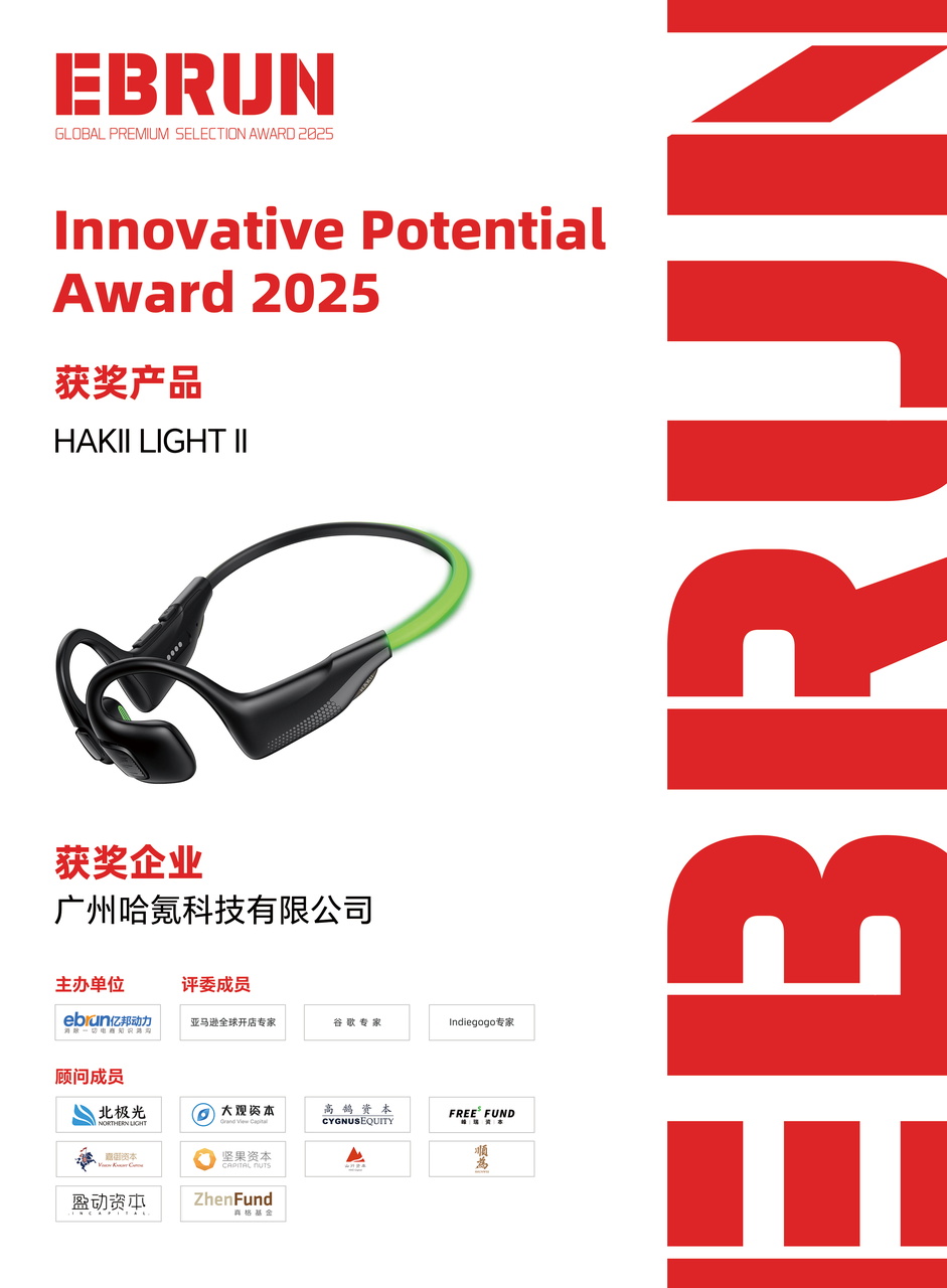 在激烈的角逐中,全球智能运动音频领域的创新先锋HAKII(广州哈氪科技有限公司) 凭借其在穿戴式音频技术上的大胆突破与美学设计脱颖而出。其年度重磅新品 “HAKII LIGHTⅡ” 经过层层评审,成功斩获2025届重要奖项——EBRUN全球好物Innovative Potential Award 2025。