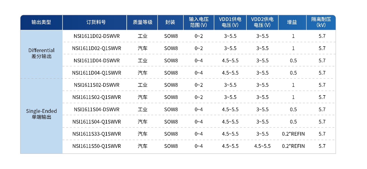 NSI1611系列包含差分输出的NSI1611D和单端输出的NSI1611S。其中,差分输出均为固定增益,单端输出则提供固定增益和可调比例增益两类选项,进一步满足不同系统架构与设计需求。