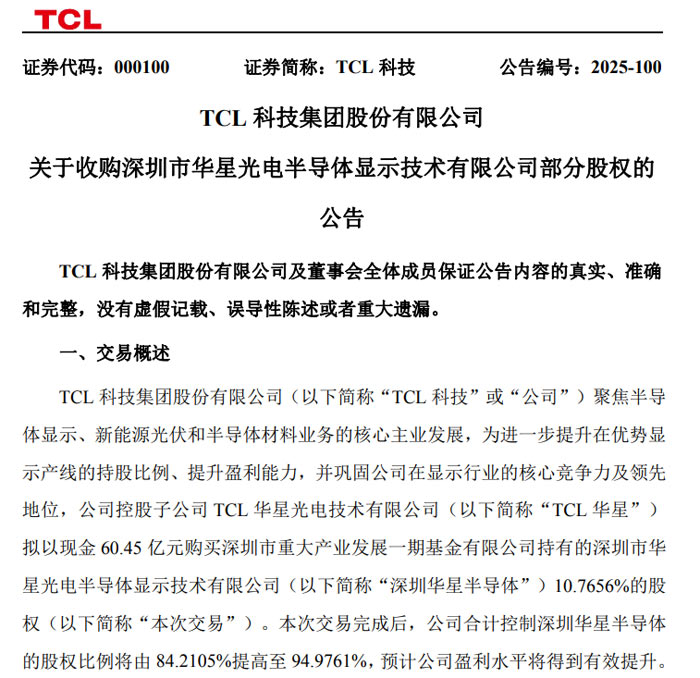 2025 年 12 月 15 日,TCL 科技集团股份有限公司(证券代码:000100,证券简称:TCL 科技)发布公告称,为进一步提升在优势显示产线的持股比例、增强盈利能力,巩固行业核心竞争力及领先地位,公司控股子公司 TCL 华星光电技术有限公司(简称 “TCL 华星”)拟以现金 60.45 亿元,收购深圳市重大产业发展一期基金有限公司持有的深圳市华星光电半导体显示技术有限公司(简称 “深圳华星半导体”)10.7656% 股权。