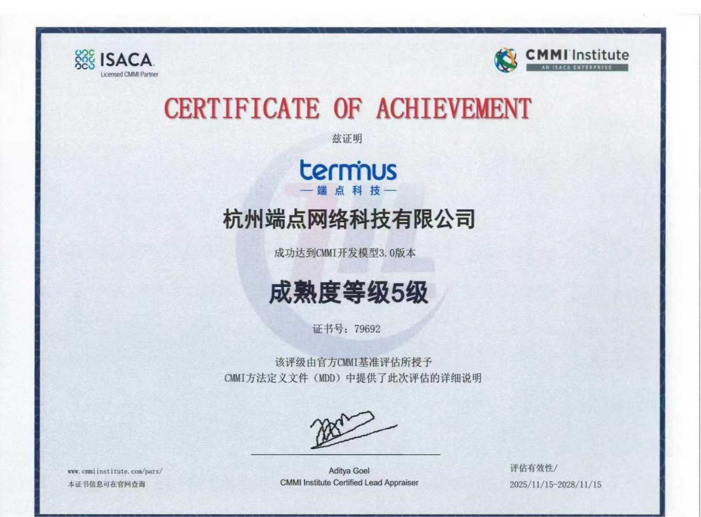 近日,杭州端点网络科技有限公司(以下简称"端点科技")软件研发整体能力成功通过CMMI 5级认证。该认证是国际软件开发领域最高成熟度等级,标志着端点科技软件整体开发能力、项目管理水平及过程优化创新等方面均达到国际领先水平,成为全球软件行业公认的卓越标杆。