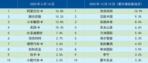 表:12月15日指数升级后,前十大成份股及其权重变化