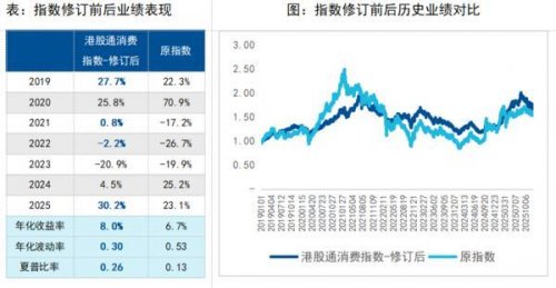 根据修订后的指数成份股进行回测,自2019年以来,修订后的港股通消费指数年化收益率更高、年化波动率更低,夏普比率也更高。2019-2025年的7年间,有4年相比原指数有超额收益,在2021、2022等年份也表现出了更强的抗跌属性。