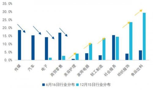 从调整后的行业分布来看,“真消费”行业板块权重显著提升,业务模糊或科技属性更强的行业被剔除。如下图所示,食品饮料、纺织服饰、家用电器、美容护理等行业占比抬升,而传媒、汽车等行业被剔除,电子、商贸零售行业的占比明显下降。