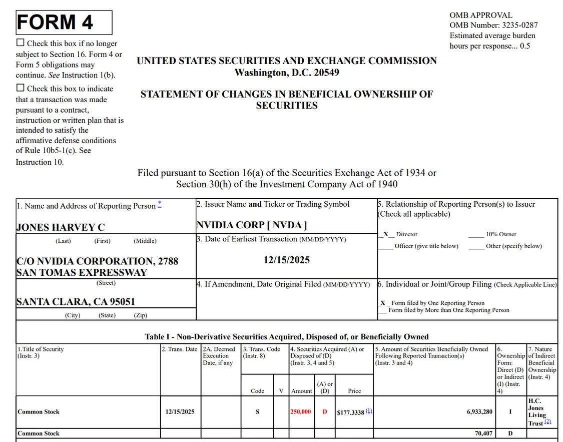 该文件显示,琼斯于12月15日出售了25万股股票,平均每股售价为 177.33 美元。自1993年公司成立以来,哈维·琼斯就一直担任英伟达的独立董事。
