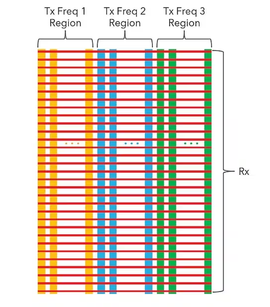 MFRPS的核心是重新构想电容触摸面板的扫描方式,以感知触感。MFRPS不是在单一频率上工作或逐个扫描,而是将面板划分为多个区域,每个区域同时工作但频率不同。这些区域并行扫描,使系统能够在更短时间内以更高保真度收集更多数据(见图2)。