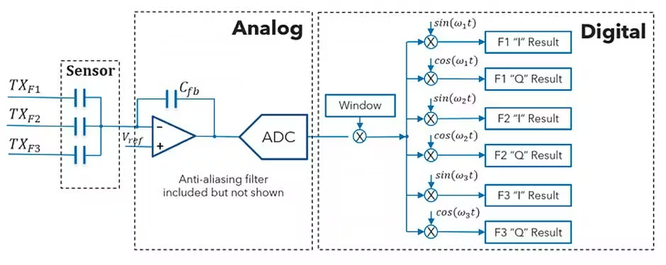 连续时间数字传感:连续时数字传感取代了传统的模拟前端(AFE),利用高速采样和实时信号处理进一步提升信噪比。触摸控制器内部的dAFE将混音台从模拟域移动到数字域。如果没有dAFE,每个混频器都需要专用的模拟电路,使用三对I/Q时总共需要六个混频器。