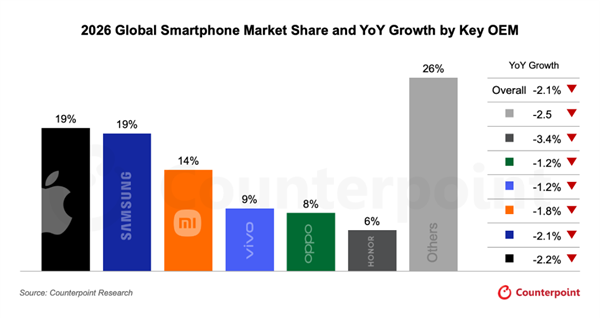 2026年全球智能手机出货量预计同比下滑2.1%,较2025年11月的旧预测下修2.6个百分点,这意味着市场将大概率连续两年收缩。