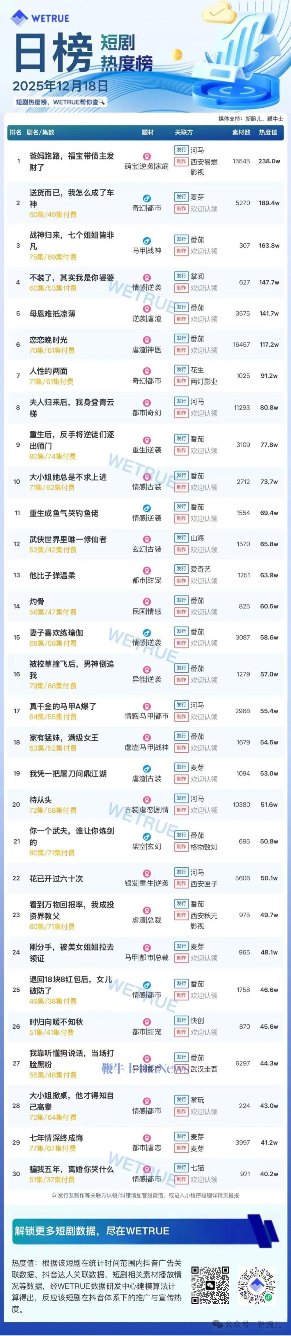 1、本日榜为WETRUE短剧数据公司提供,新腕儿和鞭牛士提供联合支持。
