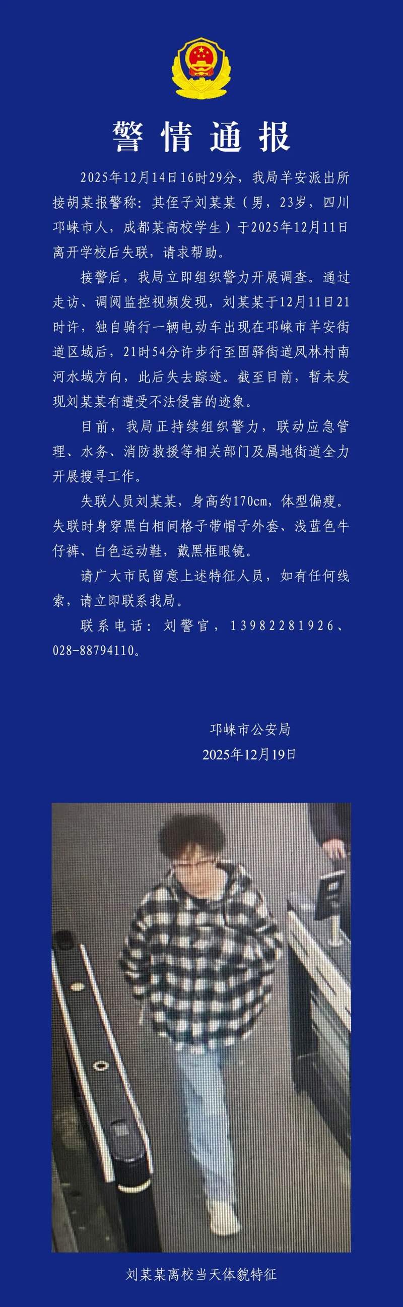 成都某高校学生失联多天 警方通报:正全力开展搜寻工作