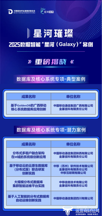 近日,由中国信息通信研究院联合中国通信标准化协会大数据技术标准推进委员会(CCSA TC601)共同组织的2025数据智能“星河(Galaxy)”案例名单正式公布。在这一代表中国数据智能领域高水平应用的权威评选中,中兴通讯GoldenDB成为本届入选案例数量最多的数据库厂商,充分彰显了在国产数据库应用领域的领先实力与深入实践。