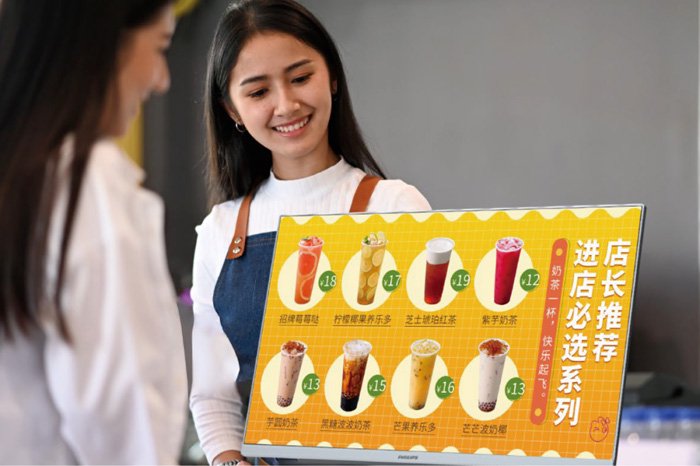 针对门店服务场景,飞利浦商显推出多尺寸吧台屏系列,高亮度防眩光屏幕确保画面清晰流畅。超窄边框与角度可调设计,能自然融入不同柜台环境。该系列为顾客提供信息查询、自助点餐等交互入口,在缩短等待时间的同时,以数字化互动提升服务质感与满意度。