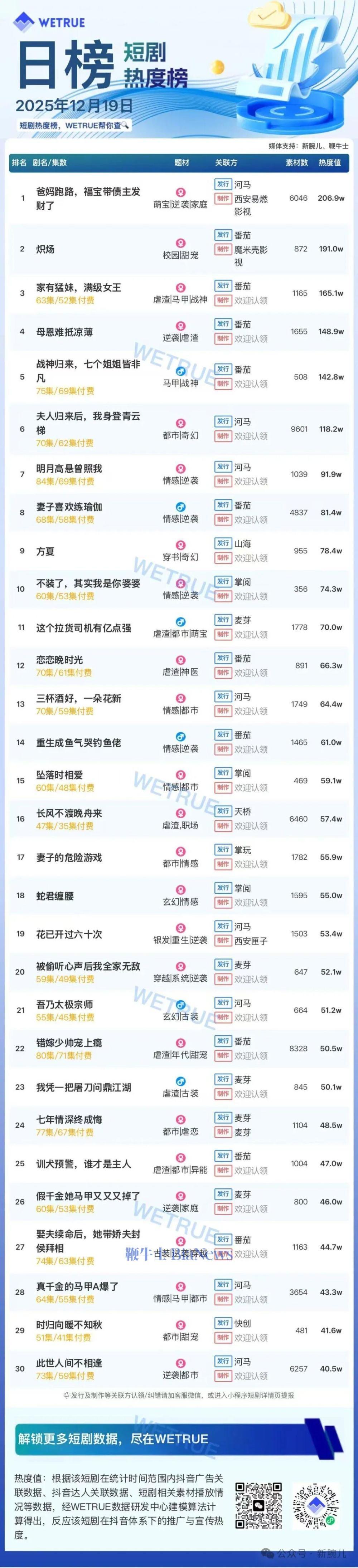 19日短剧热度榜:《爸妈跑路,福宝带债主发财了》连续第一,大盘热度4250万
