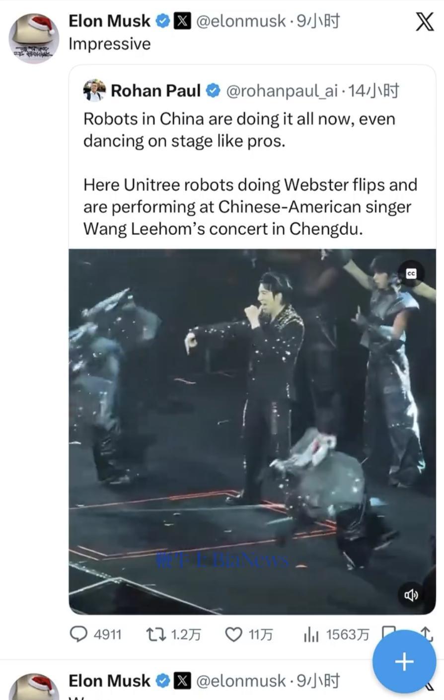 近日,王力宏演唱会首次引入宇树科技G1人形机器人伴舞。视频在网上发布后,马斯克留言称“Impressive”(印象深刻)。