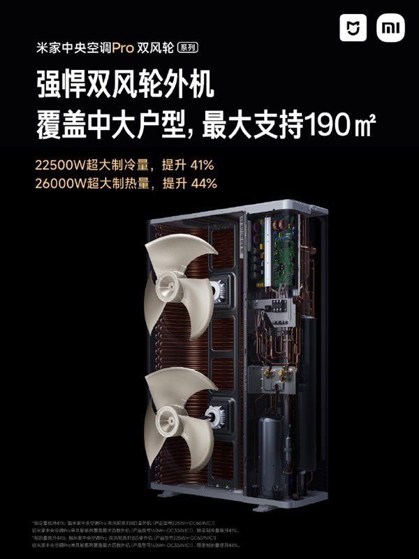 据介绍,米家中央空调Pro双风轮系列专为中大户型设计,最大覆盖面积190m²,该系列覆盖5至8匹全档位配置。