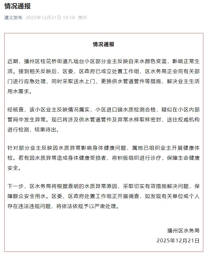 新京报讯 贵州省遵义市播州区水务局12月21日通报:近期,播州区桂花桥街道九珑台小区部分业主反映自来水颜色变蓝,影响正常生活。接到相关反映后,区委、区政府已成立处置工作组,区水务局正会同有关部门进行应急处理,同时采取送水上门、更换供水管道管件等措施,解决业主生活用水需求。