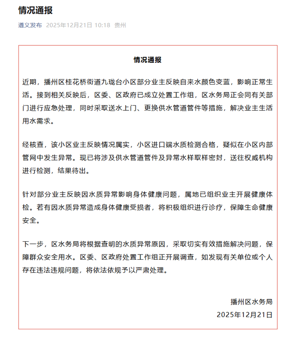 快科技12月21日消息,近期,贵州遵义九珑台小区部分业主反映,自来水的颜色变蓝了,影响正常生活。