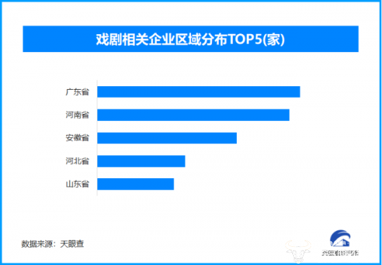 天眼查专业版数据显示,截至目前我国现存在业、存续状态的戏剧相关企业超9500余家。从区域分布来看,广东省、河南省、安徽省戏剧相关企业数量位居前列,三个省市数量总和超过4100家,占企业总数的43.6%。