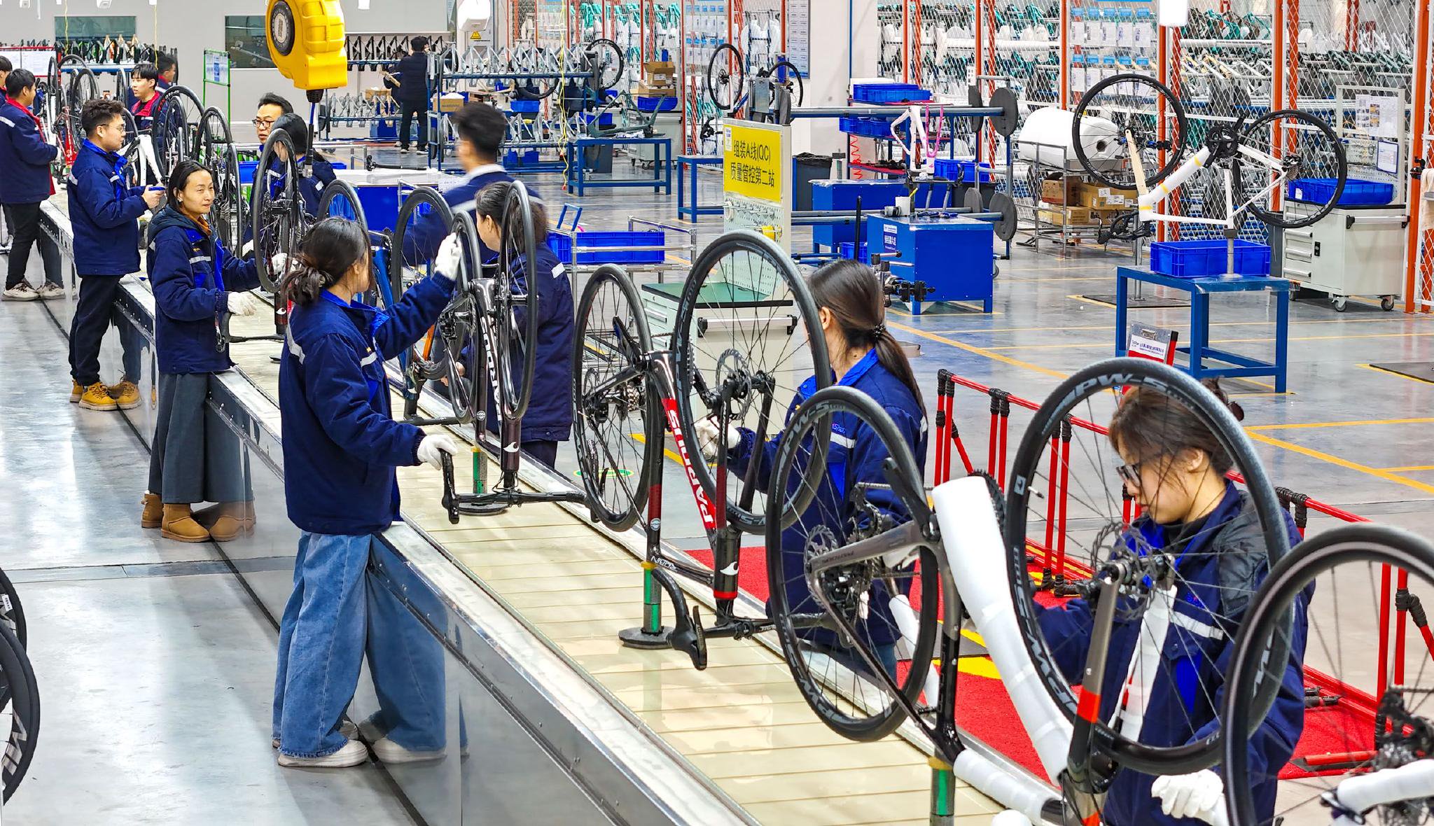 山东省乐陵市近年来聚力发展体育产业,借助科技创新和标准研究,不断提高产品在国内外市场上的竞争力、影响力,为国内外重大赛事提供器材支持和专业服务保障,形成颇具规模效益的体育装备产业集群。图为在位于山东德州乐陵市的泰山体育产业集团有限公司的生产车间,工人在组装运动自行车(无人机照片)。