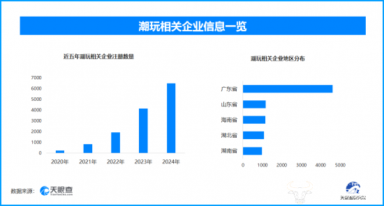 天眼查专业版数据显示,截至目前我国现存在业、存续状态的潮玩相关企业超2.1万家。其中,2025年截至目前新增注册相关企业约7100余家,从企业注册数量趋势来看,近五年间,潮玩相关企业的注册数量呈现出逐年增长的态势,并在2024年达到顶峰。