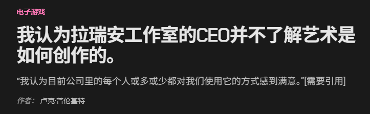 还有像拉瑞安工作室的CEO Swen Vincke仅仅只是表示会将AI用于生成创意点子、制作PPT等初期工作,并且强调正式内容仍会由人工完成,但依旧遭到了玩家们的不满,甚至连游戏媒体aftermath都用攻击性很高的标题来批评他的言论。