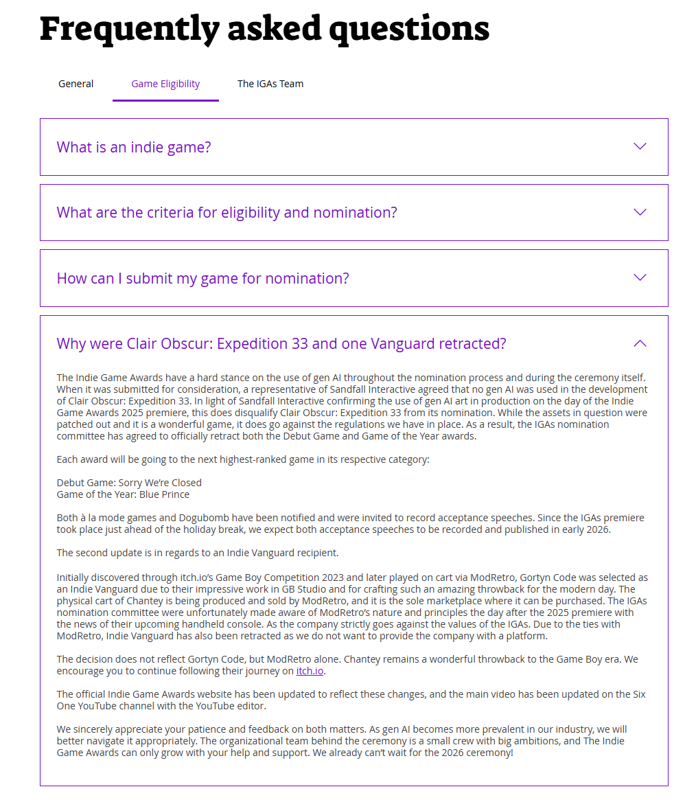 但就在昨天,The Indie Game Awards官方突然宣布撤回原本已经颁给《33号远征队》的两大奖项,但原因倒不是因为它“独立游戏”的定义之争,而是被证实在开发过程中使用了“生成式AI”。