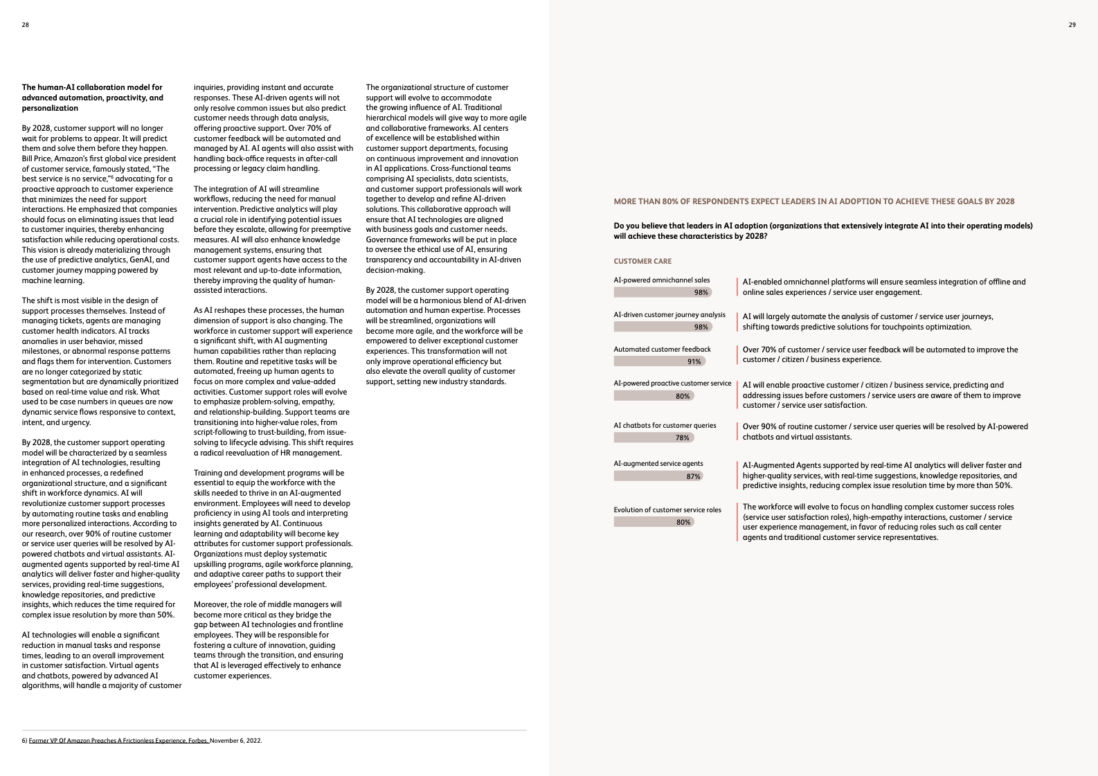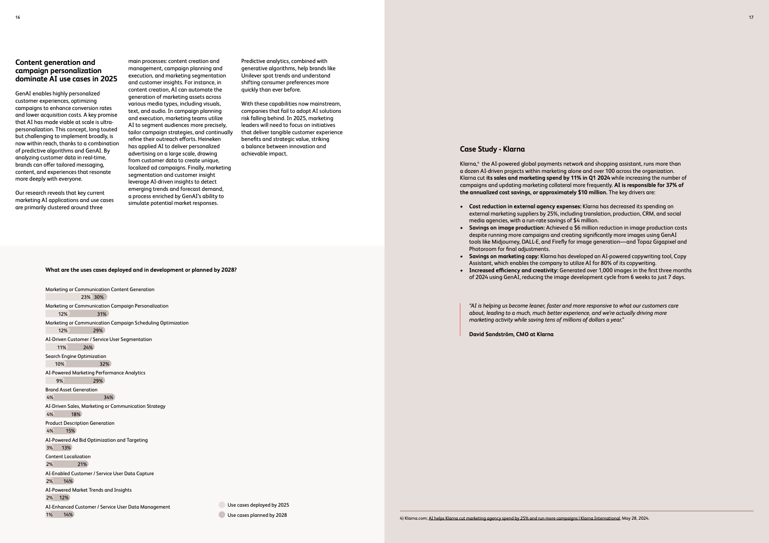 客户服务正从成本中心演变为价值中心。未来,超过90%的常规客户查询将由AI聊天机器人解决,复杂问题的处理时间将缩短50%以上。金融科技公司Klarna的实践为此提供了有力佐证:通过应用AI,其销售与营销支出在2024年第一季度削减了11%,其中AI贡献了约1000万美元的年化成本节约,清晰地展示了AI在提升效率与实现商业回报上的巨大潜力。
