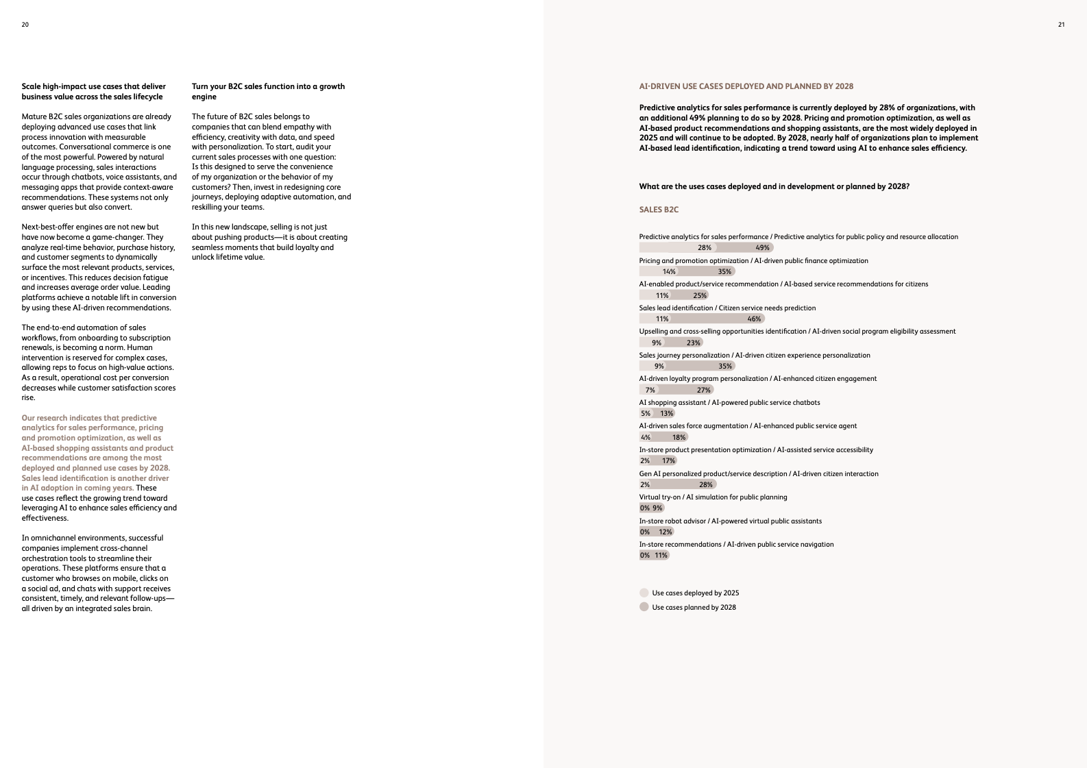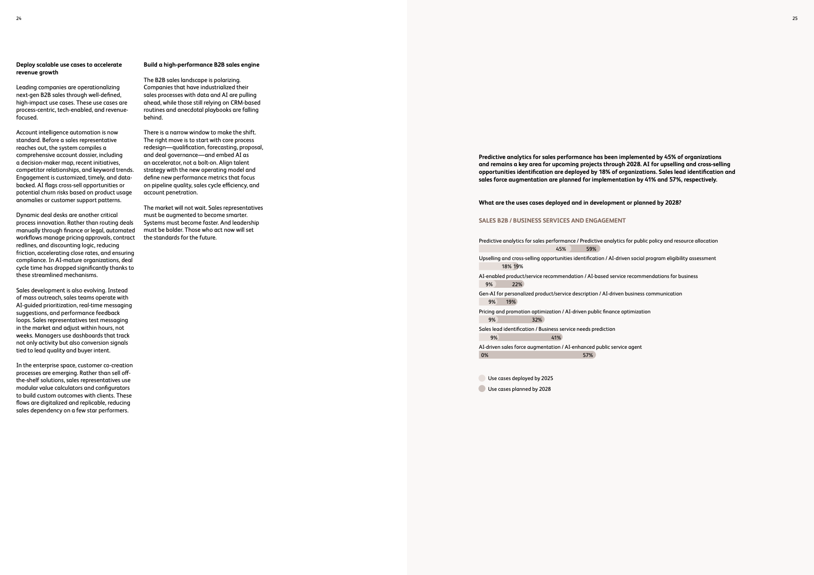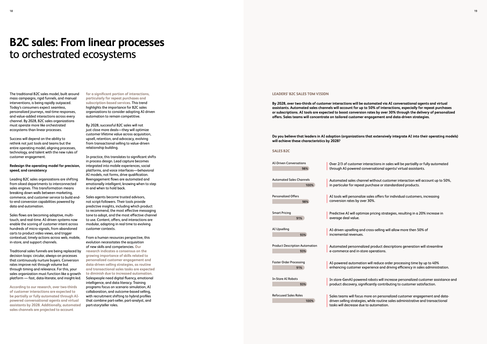 销售职能的变革同样剧烈。在B2C领域,预计超过三分之二的客户互动将由AI会话代理实现自动化,而自动化销售渠道将处理高达50%的交易。在更为复杂的B2B场景中,超过50%的销售流程将通过会话式AI界面执行,技术增强的互动将覆盖90%的买卖双方沟通,并将销售团队在前期勘探上花费的时间锐减50%以上。