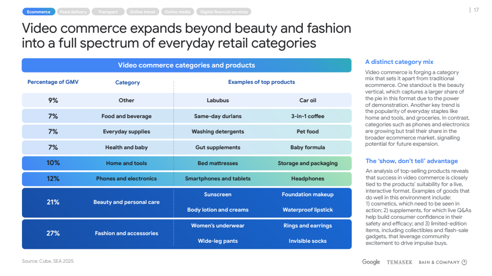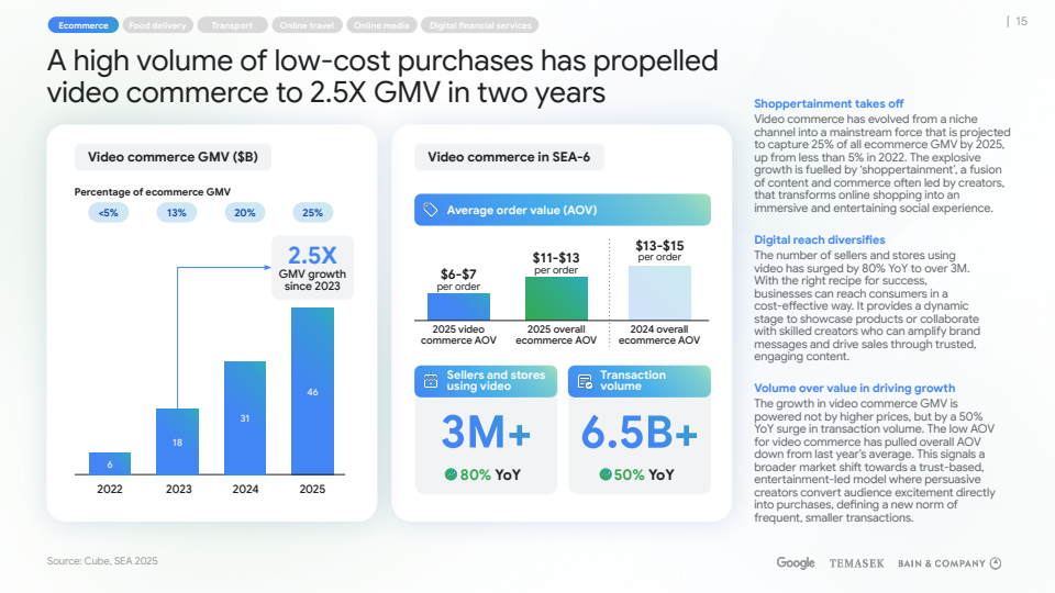 从增长结构看,整体GMV与收入连续两年保持约15%的同比增速。电商、外卖、出行、在线旅游与在线媒体仍是核心引擎,其中视频电商成为最具结构性变化的变量。2025年视频电商已贡献约25%的电商GMV,占比从2022年的不足5%快速跃升,GMV两年增长2.5倍,主要由交易量同比50%的增长驱动,而非客单价提升 。