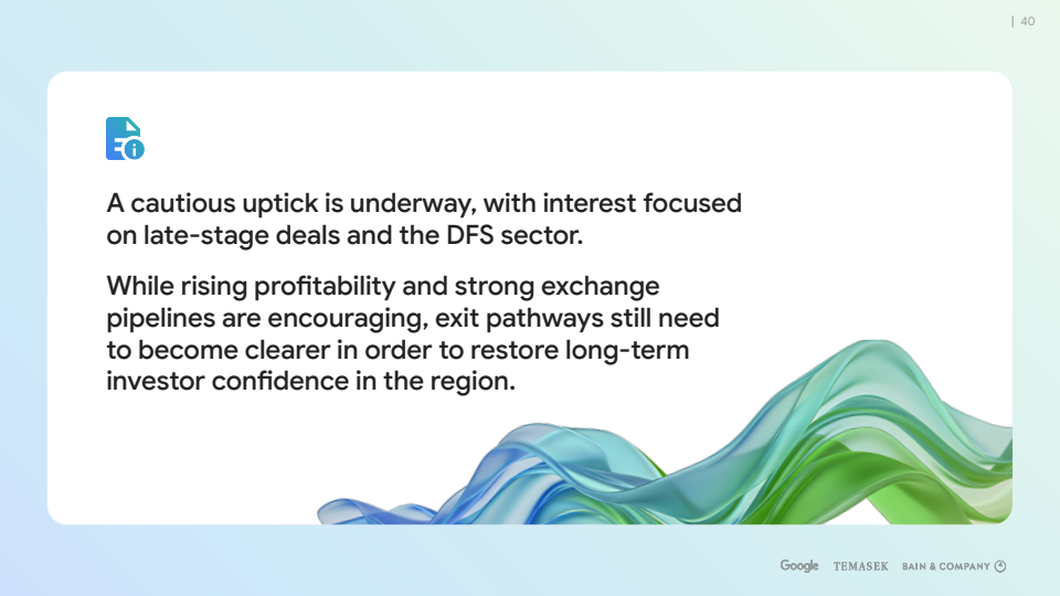 投资端出现谨慎修复。过去12个月私募融资回升15%至77亿美元,但仍较2021年高点低约70%。资金明显向后期项目集中,C轮及以后占比接近80%。AI成为最重要的资金主题,约30%的新增资金投向AI相关企业,区域内活跃AI初创公司已接近700家 。