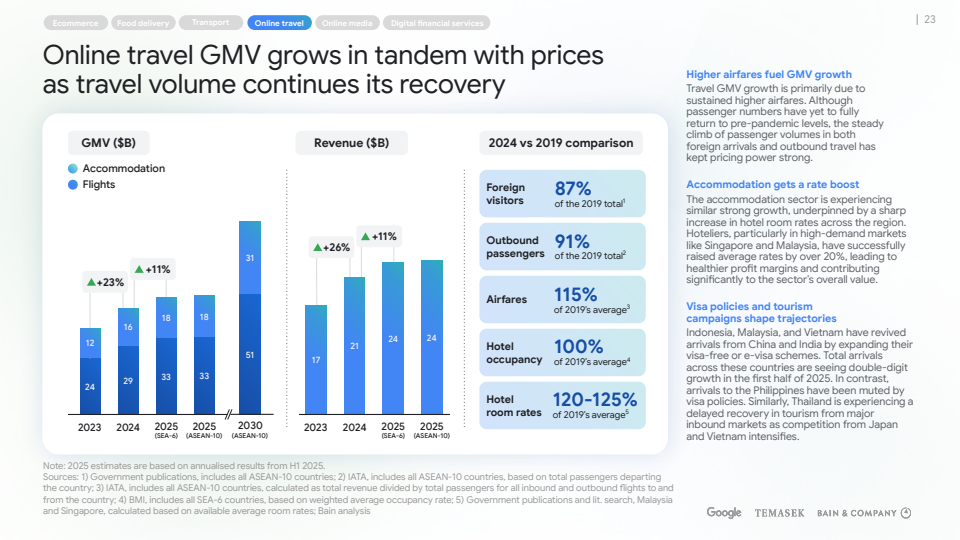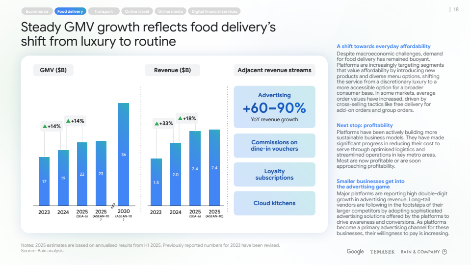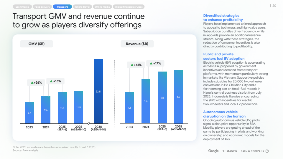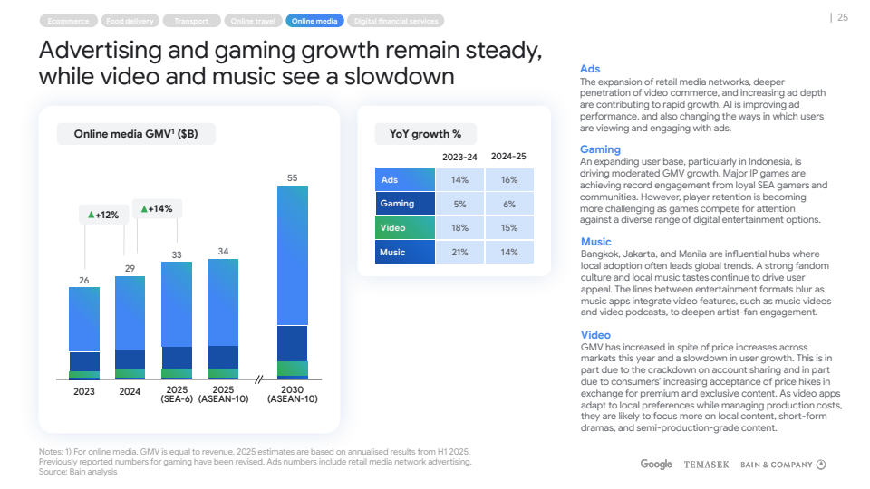 根据Google、淡马锡与贝恩联合发布的《2025年东南亚数字经济》报告,东南亚区域数字经济GMV预计在2025年突破3000亿美元,是十年前最初预测的1.5倍,同时收入规模在2024年后显著加速,预计达到1350亿美元,十年增长11.2倍 。