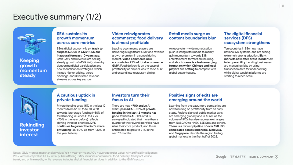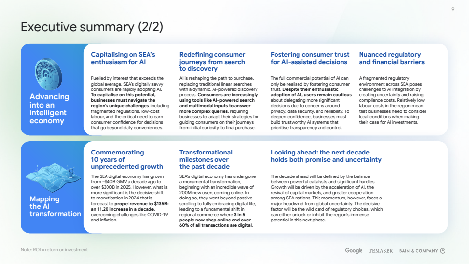 趋势洞察上,东南亚数字经济的下一阶段不再取决于用户规模扩张,而取决于三点:一是AI驱动的变现效率提升,二是跨境支付与数据基础设施的区域协同,三是监管对AI与数字金融的制度选择。若三者形成正向合力,东南亚有望在未来十年继续跑赢多数新兴市场,进入以“智能密度”而非“用户红利”为核心的新增长周期。
