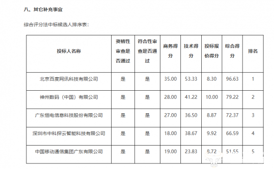 在对投标须知进行了一次更正后(“允许联合体投标”更正为“不允许联合体投标”),项目于12月14日发布中标公告,包括百度、神州数码、广东移动在内多家知名厂商现身候选人名单。