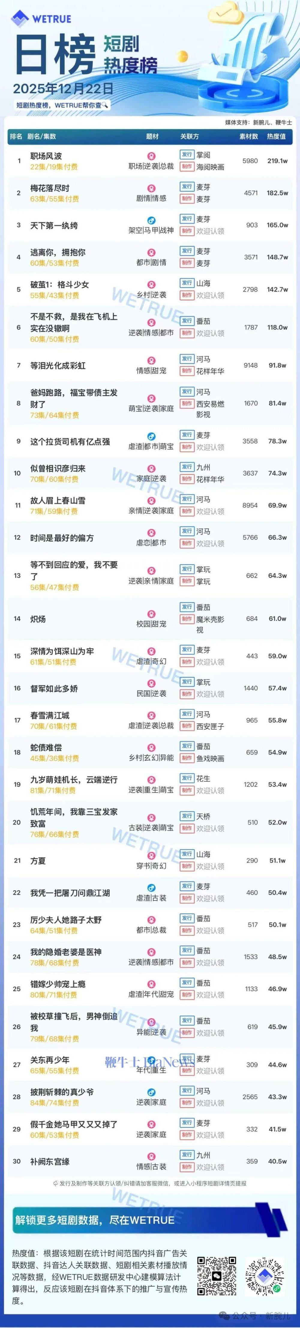 22日短剧热度榜:《职场风波》第一,大盘热度4251万