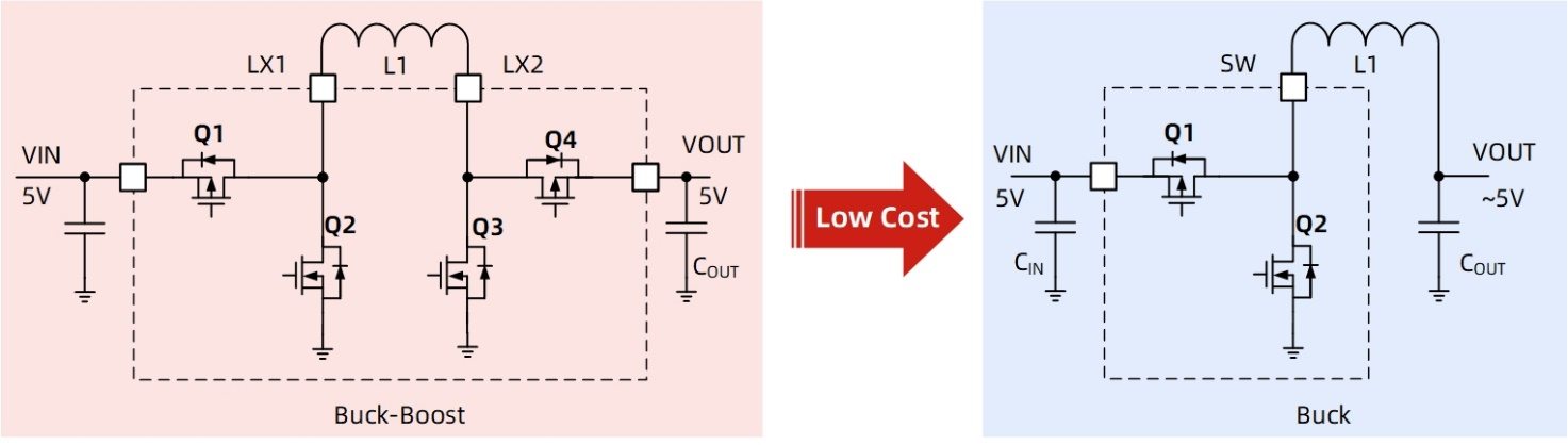 在 USB Hub 和 PD 应用场景中,当输入电压与输出电压保持一致时(如 5V 输入、5V 输出),支持直通模式的 buck 方案,相比传统四开关 buck-boost 方案能极大降低系统成本。现有的传统 buck 通常存在最大占空比不足,以及内置 MOS 导通电阻过大的缺点,导致此类应用压降大,输出电压难以符合应用要求。SC813XX 针对上述问题,将最大占空比提高至 99.5%,结合低阻 MOSFET,直通模式下,输出电压跌落低,性能表现突出。
