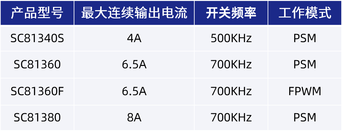 SC813XX 系列提供多种输出电流与开关频率选项,并设有 PSM(节能模式)与 FPWM(强制 PWM)两种工作模式版本。用户可根据应用场景需求进行产品选择。