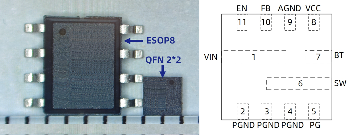 左 QFN 2*2 与 ESOP8 封装尺寸对比;右 SC813XX 引脚图,QFN 2*2 封装