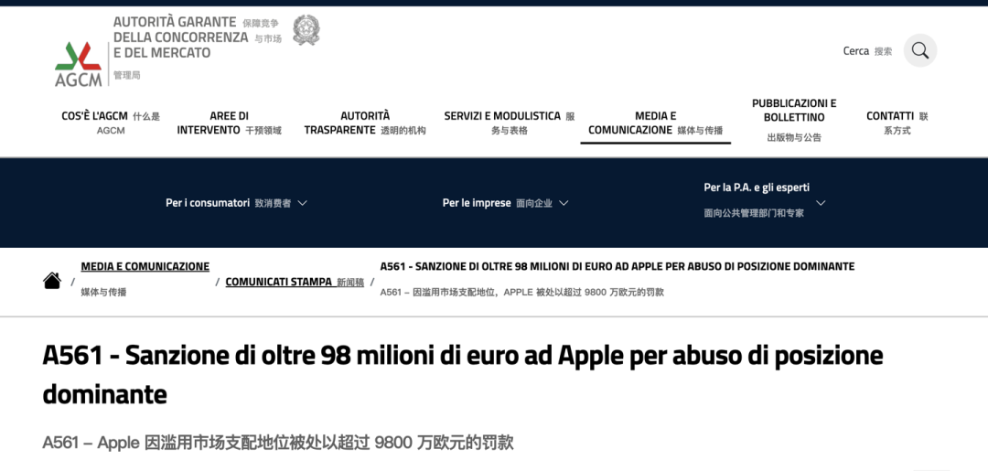 12月22日,意大利竞争监管机构宣布对美国科技巨头苹果公司及其两家子公司处以9860万欧元(约合1.1553亿美元,8.14亿元人民币)罚款,理由是其涉嫌滥用市场支配地位,限制iOS用户获取移动应用程序的渠道。截至发稿时,苹果公司尚未对此次处罚作出公开回应。