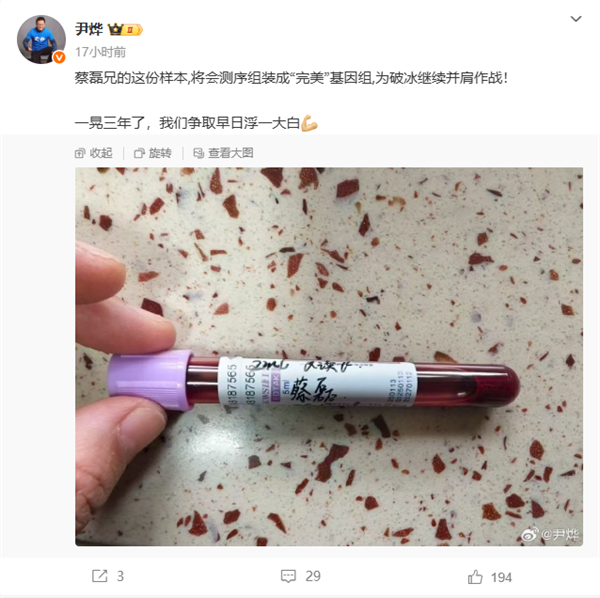 快科技12月23日消息,昨晚,华大集团CEO尹烨在微博晒出蔡磊的血液样本。