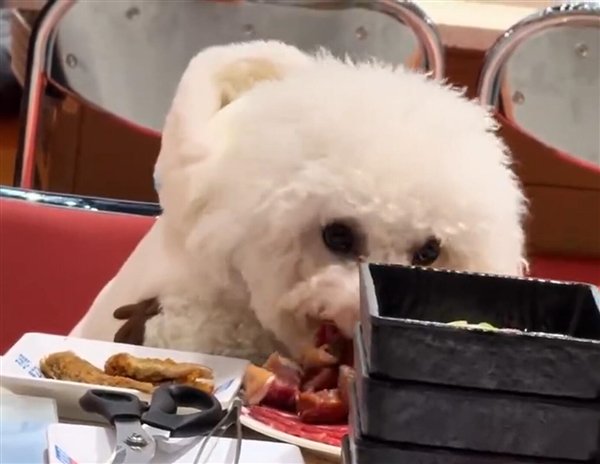 12月23日消息,据媒体报道,安徽合肥一家烤肉店有宠物狗上桌吃饭,餐桌上的餐盘里放有食物,宠物狗在不断地啃食生肉。