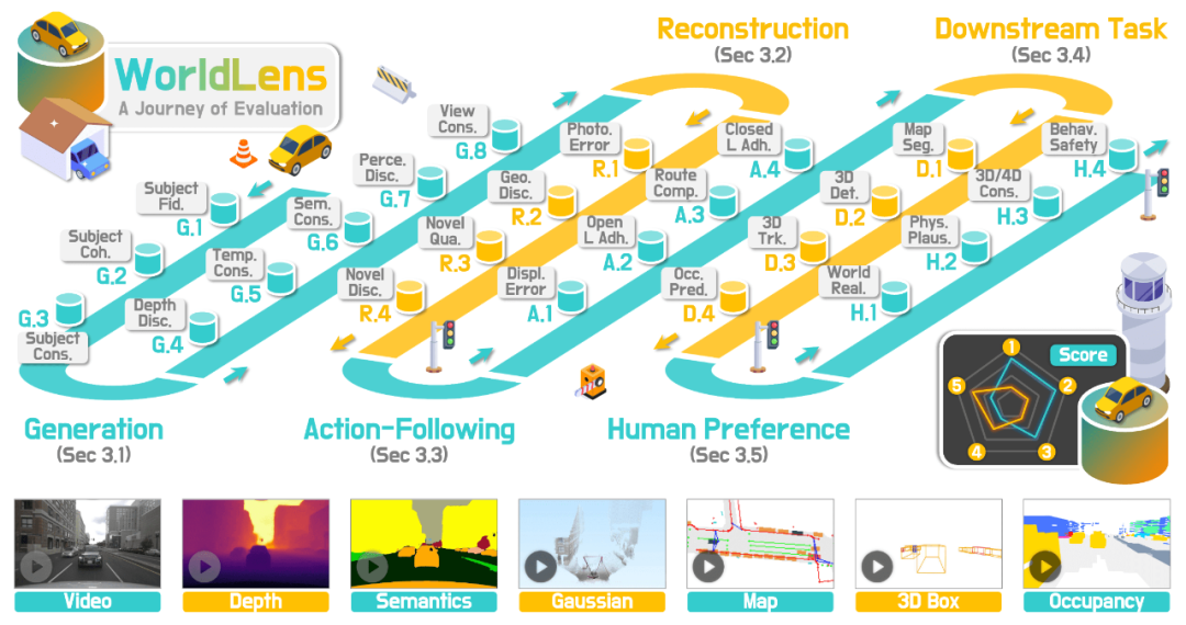 WorldLens并不试图用一个分数给世界模型「盖棺定论」,而是把评估拆成五个互补的 Aspect,让每个 Aspect 回答一个现实问题: