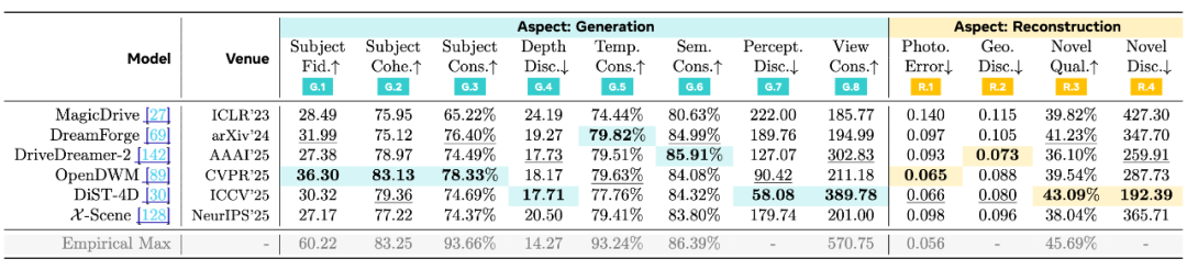 现实中,我们经常看到一种现象:有的模型生成的视频纹理很强、观感极佳,但多视角几何对不上,时序也容易抖;有的模型几何更稳,却在行为层面频繁出现不合理运动;也有模型在开环指标上看似过关,但闭环很快崩掉。更麻烦的是,不同工作各用各的评测,结论难以对齐,失败模式也难以复现与归因。