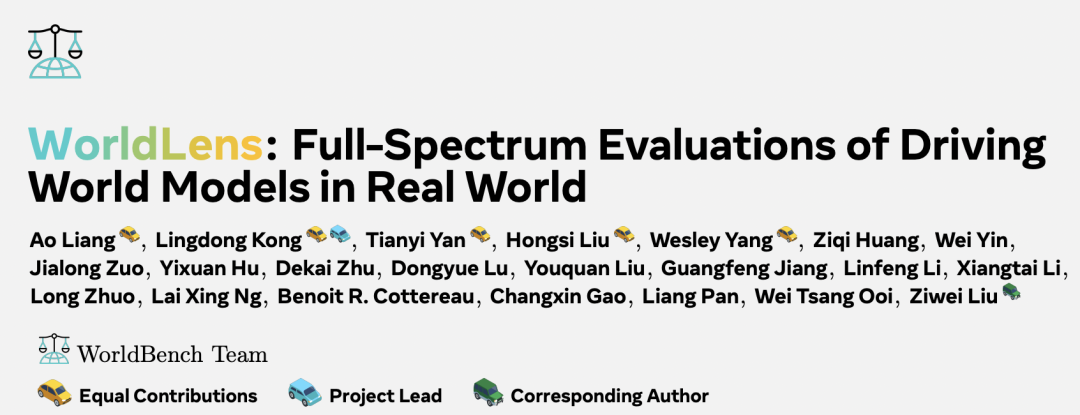 本工作由 WorldBench 团队完成,该团队汇集了来自世界模型、视频生成、自动驾驶等方向的研究者,在领域内构建了体系化、易用、性能可靠的各类生成 / 评测框架,包括 VBench、LiDARCrafter、DynamicCity、DrivingSphere、AD-R1 等