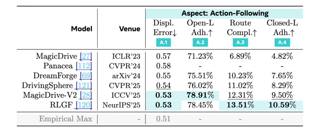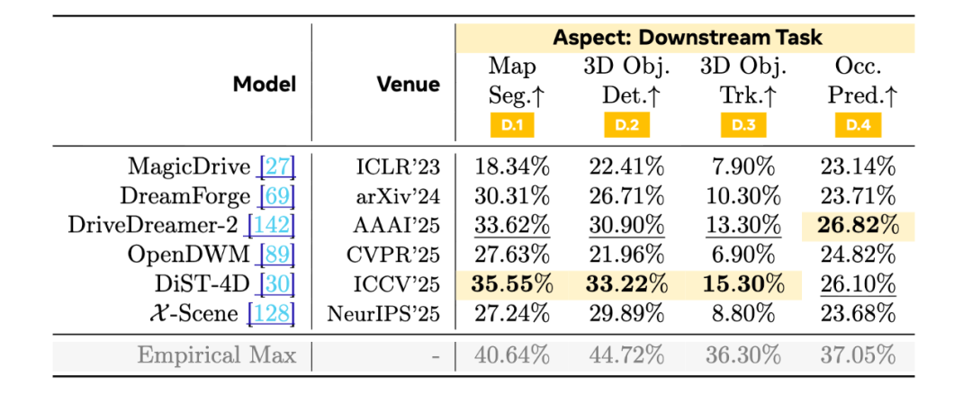 这部分评测的价值在于,它把「世界模型是否有用」从理论讨论落到了具体任务与具体数字上,并且指出了改进方向:如果目标是数据引擎,仅提升纹理质量远远不够,结构与时间层面的对齐往往才是关键。