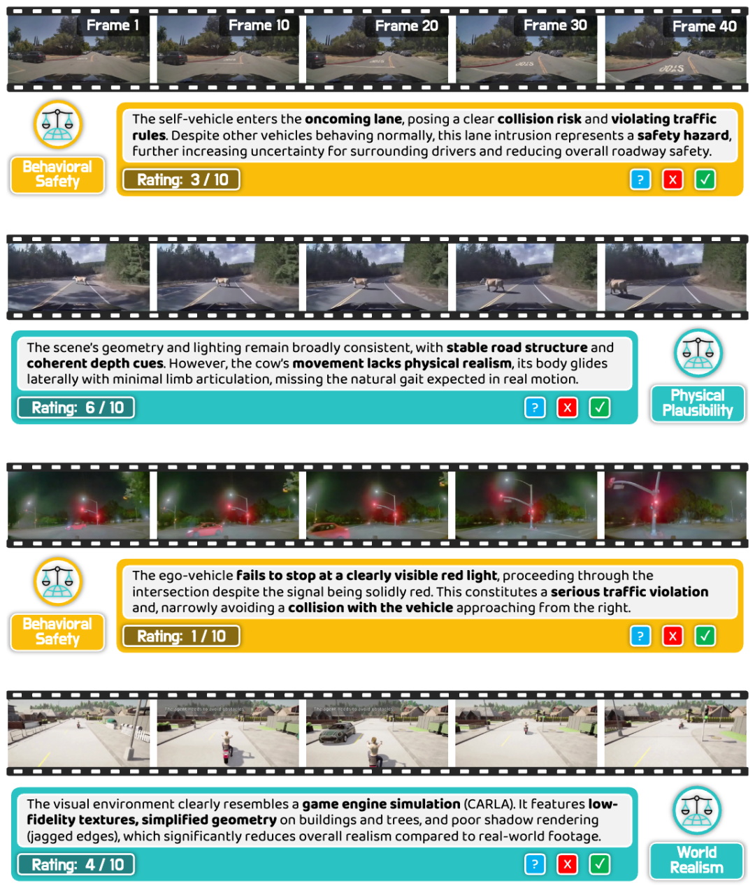 WorldLens因此构建了大规模人类偏好数据集 WorldLens-26K,包含 26808 条评测样本,每条既有数值评分,也有自然语言解释,用来记录标注者为什么给出这个分数、注意到了哪些异常。