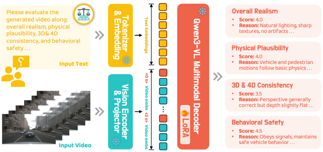 更重要的是,WorldLens并没有把人类评测停留在「投票式打分」,而是把这些偏好监督进一步用于训练自动评估代理 WorldLens-Agent。该 Agent 能输出与人类偏好一致的评分,并生成可解释的理由,从而在不重复大规模人工标注的前提下,实现可扩展、可复现的主观评估。