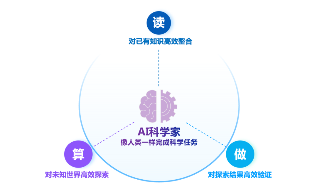 支撑丰富的产品服务体系与科研生态的底层基础设施,是深势科技历时七年持续构建的“深势·宇知”基座。“深势·宇知”最初是一套面向科学领域的预训练大模型体系,现已全面升级为科学发现智能引擎:以科学智能体为驱动,贯通“读—算—做”闭环,面向 AI4S 场景构建通往人类未知知识的最短路径——读整合既有知识,算探索生成未知空间,做完成验证闭环,“AI 科学家”由此成为能够学习、思考、执行与反馈的发现主体。