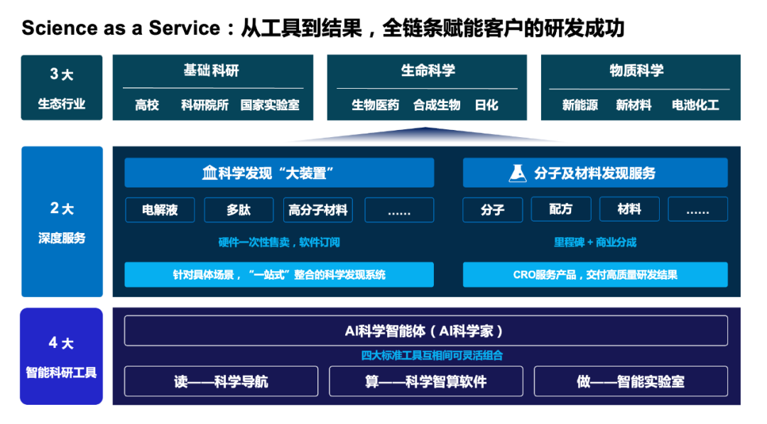 围绕这一科学发现智能引擎,深势科技将科学数据、计算与实验能力统一沉淀为可调用的研发基础设施:玻尔·科学导航已整合超过1.7亿篇高质量英文文献、超过2亿篇专利和8000万篇中文文献知识内容;基于原子、分子、基因、蛋白等方向 AI4S 大模型构建的垂类应用模型已逾千个;依托玻尔·UniLabOS 智能实验室操作系统,已整合100+款高频使用的实验仪器;通过自动化编译与部署能力,已支持5万+科学工具以Agent-Ready的形态被统一调用。平台正服务来自全球1000+所高校与科研机构的300多万名科学家用户,在真实科研任务中持续产生使用与反馈,逐步形成“科研工具—科研内容—科研人员”相互促进的生态循环。