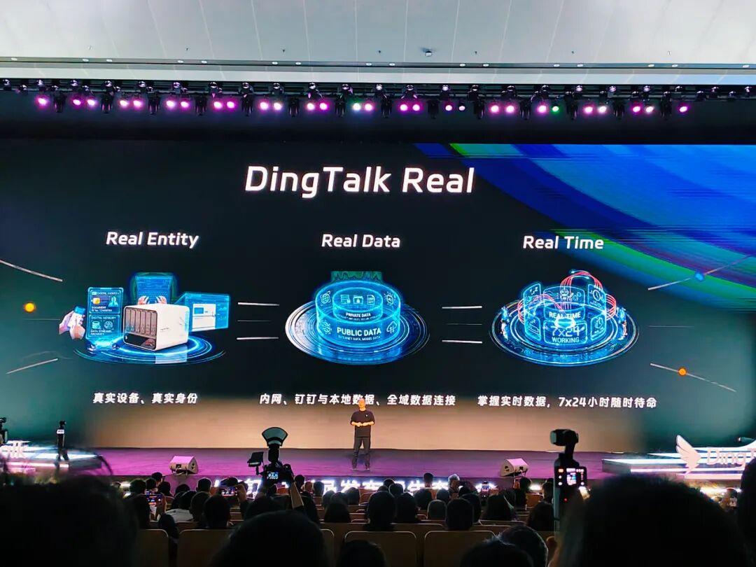 他说,这个神秘的新品名叫「DingTalk Real」,是 AI 钉钉 2.0 的雏形。它可以让钉钉在你的电脑上为你持续工作,在内部环境中访问你所有的数据,7×24 小时不间断地为你解决问题、发现机会。这一预告可以说是把场内外观众的好奇心直接拉满。